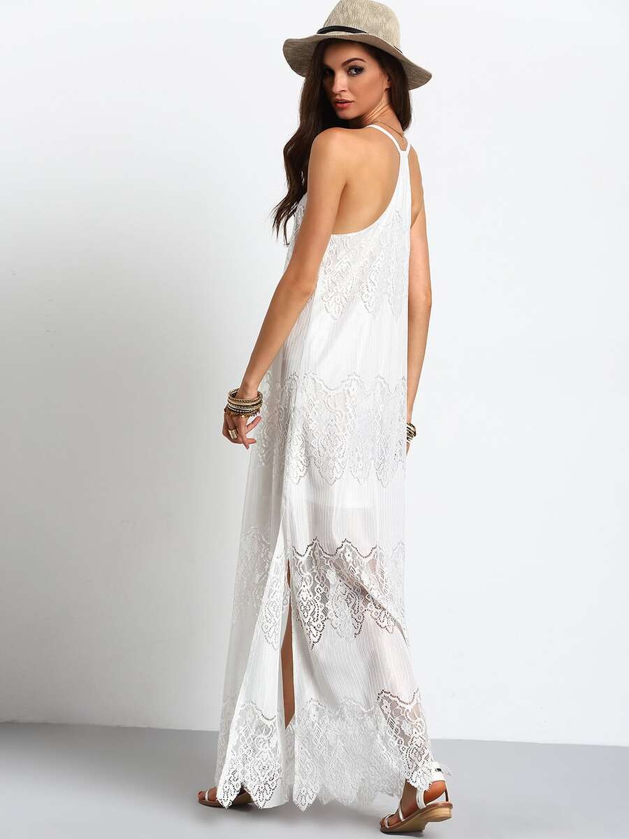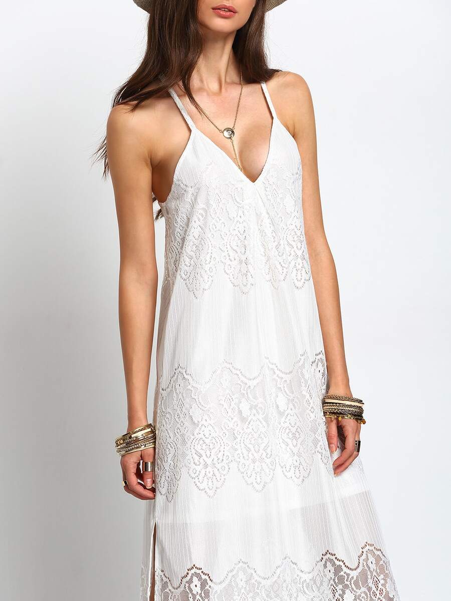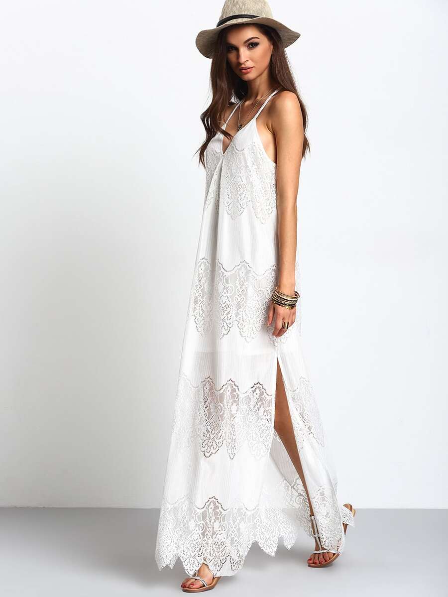 فستان ماكسي أبيض كريمي تصميم فريد ياقة V عميقة