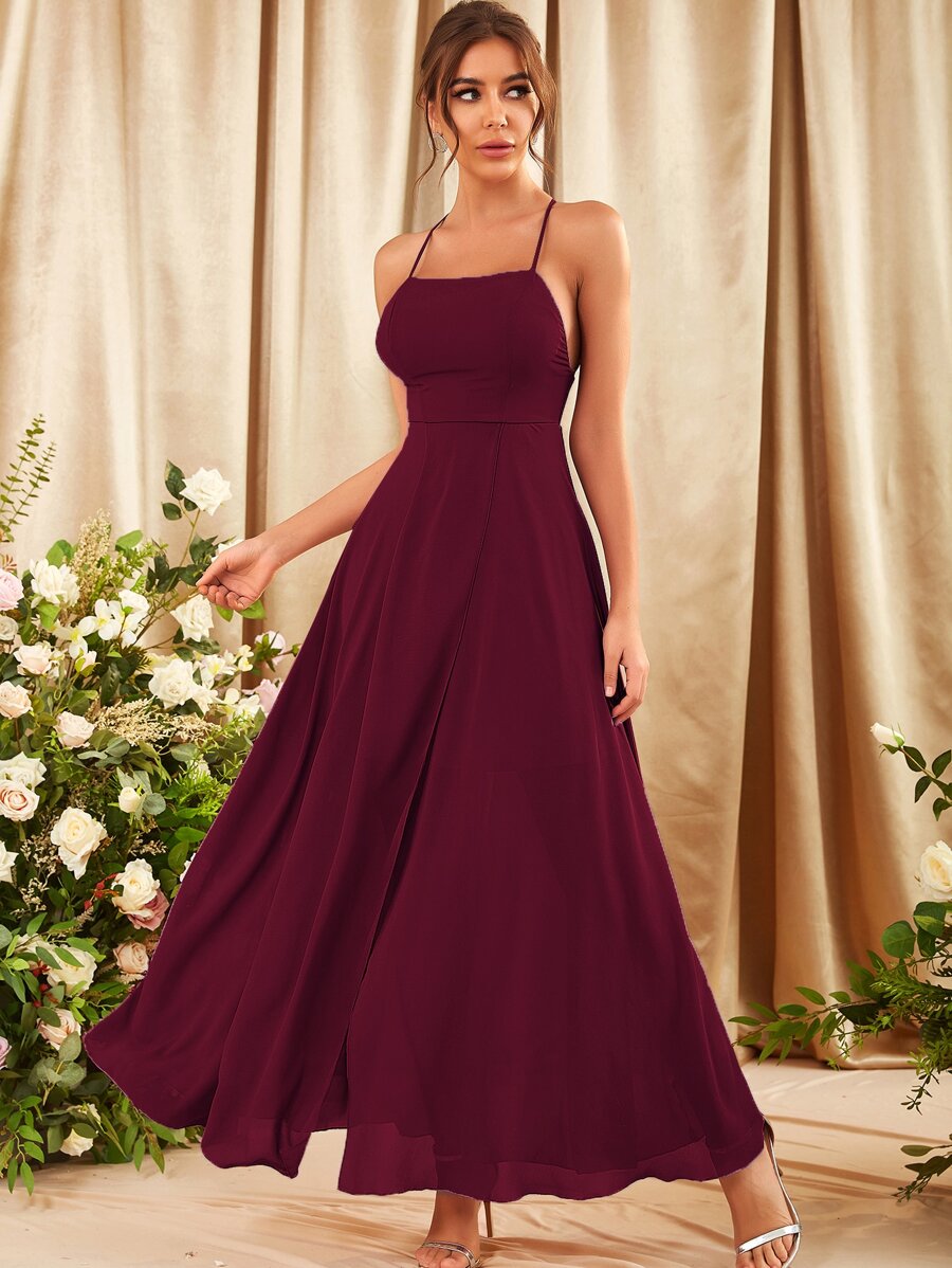 فستان وصيفة العروس قصير الظهر بتقاطع مع شق مطرز الحاشية، فستان أنيق