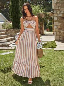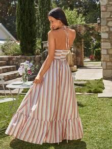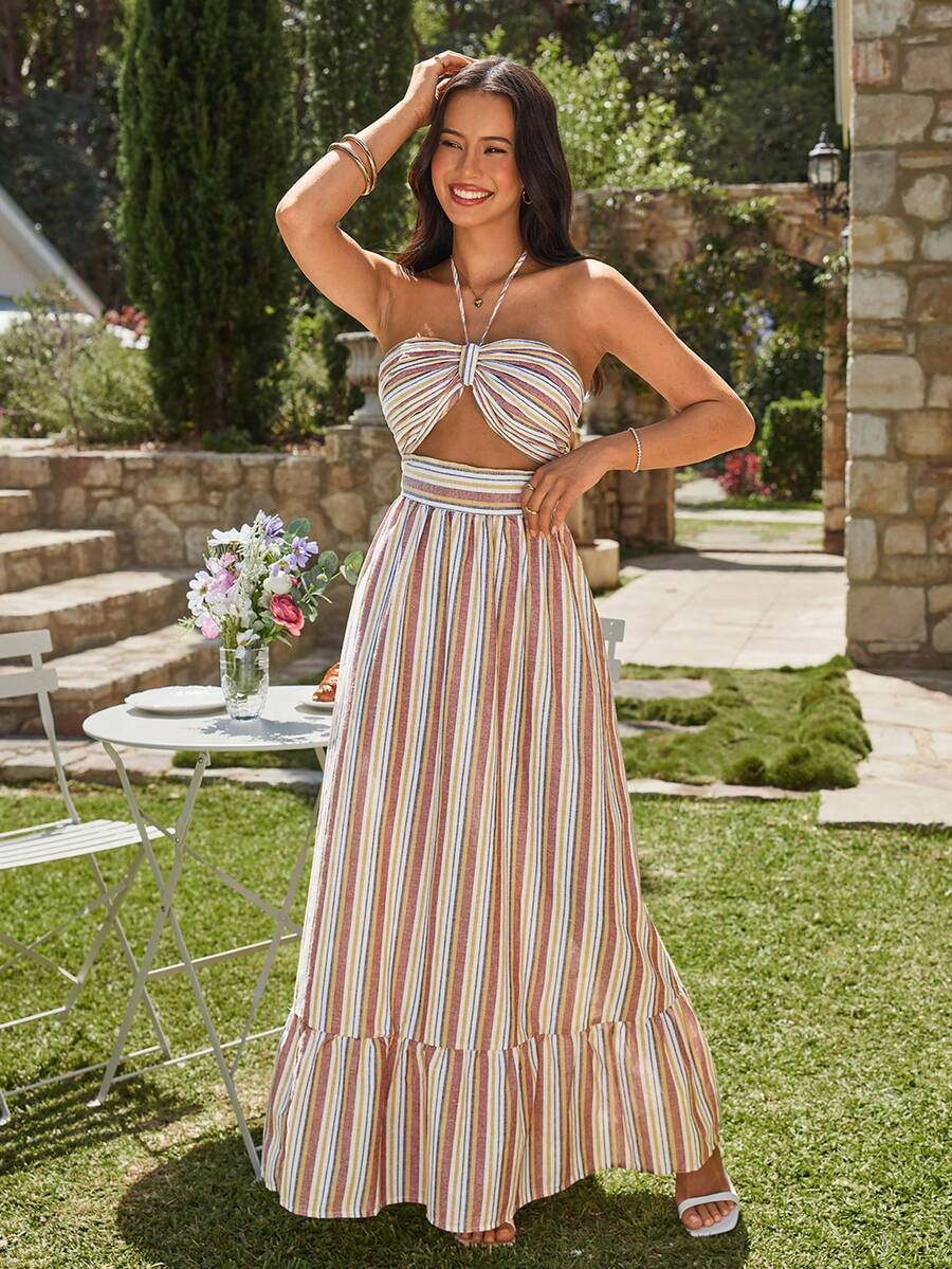 فستان رسن بحافة مكشكش مخطط بتفاصيل مقصوص