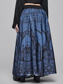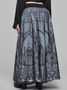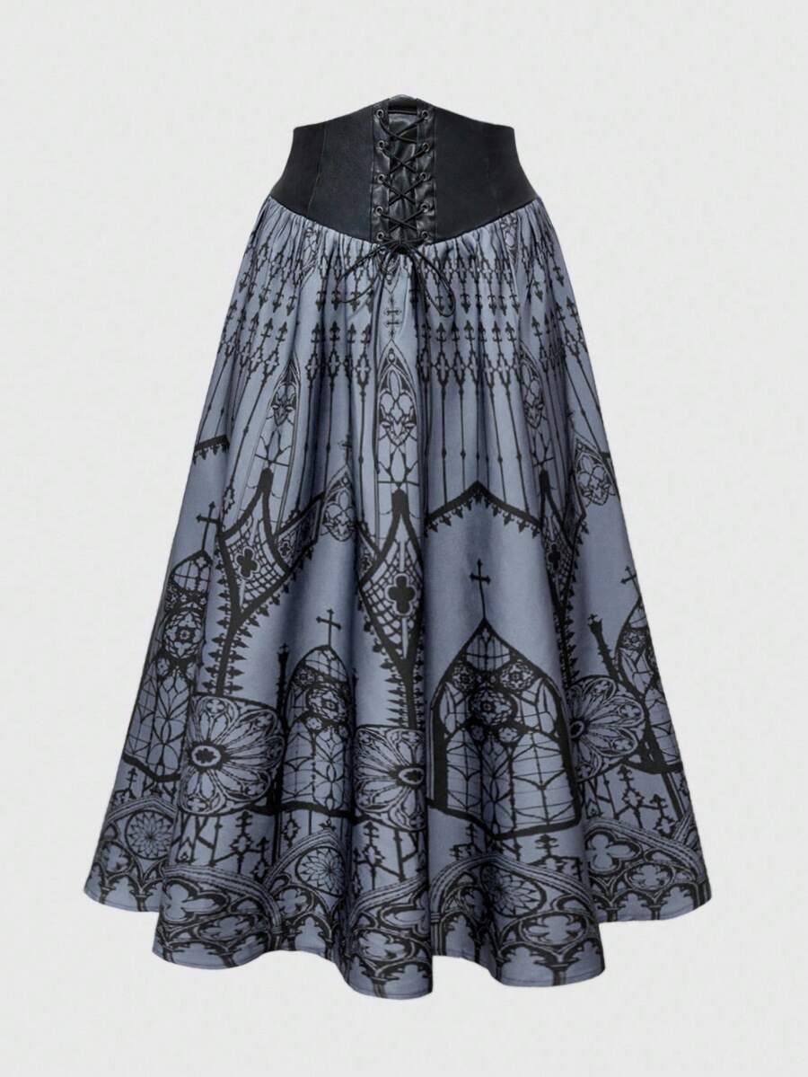 EDITION تنورة متوسطة الطول مزينة برسم قلعة جوتية داكنة للنساء ذوات الحجم الكبير، مصنوعة من قماش البولي يوريثان مع خصر مشدود