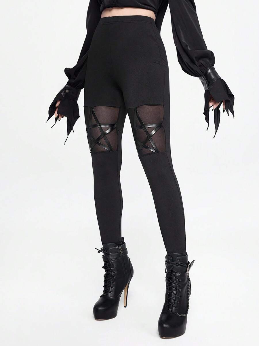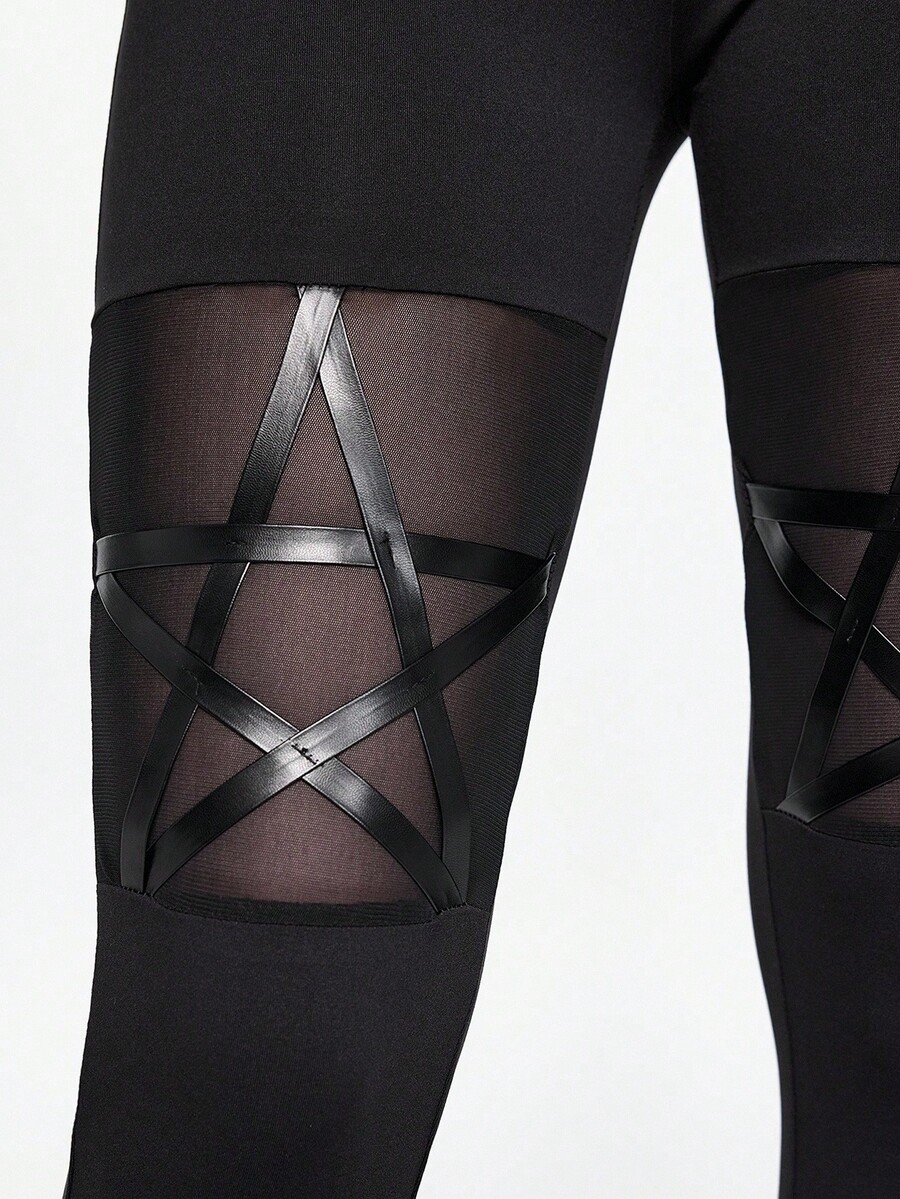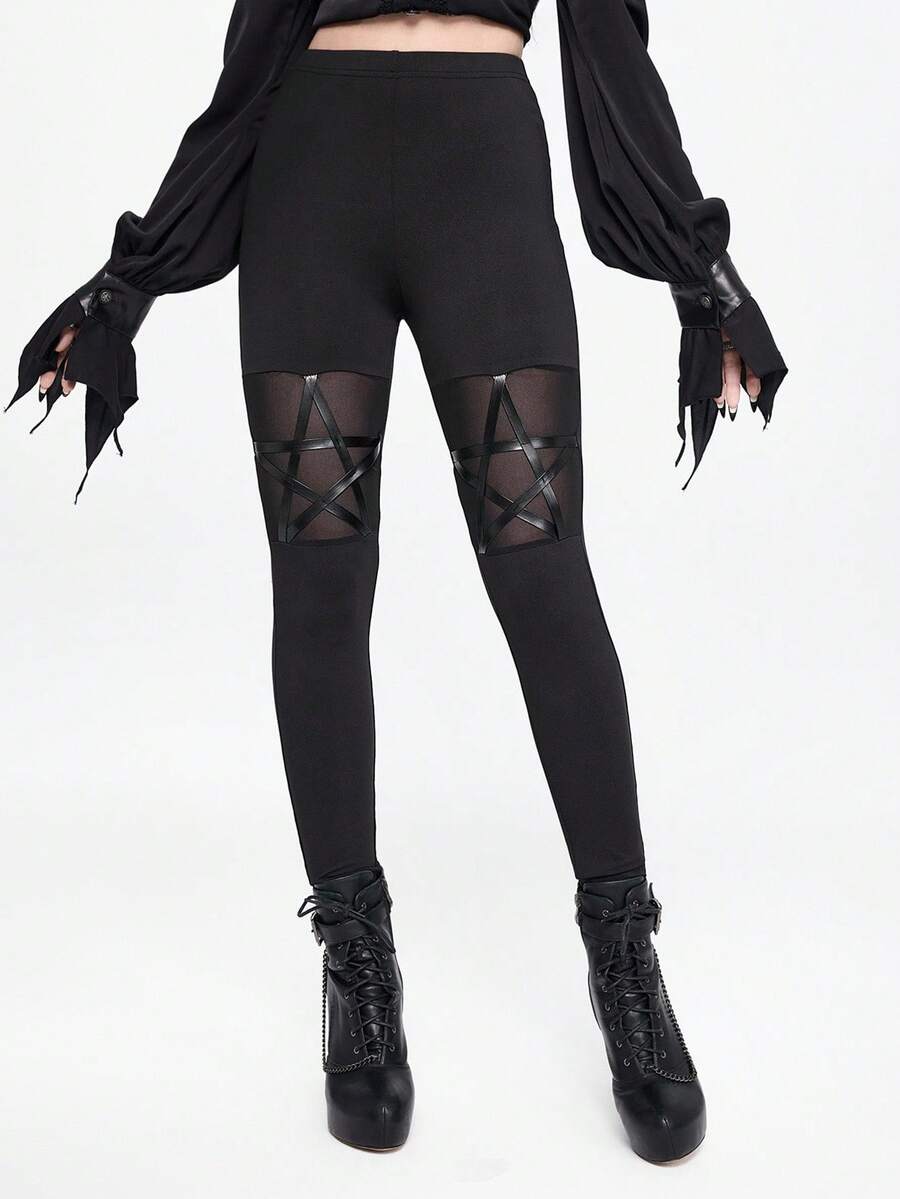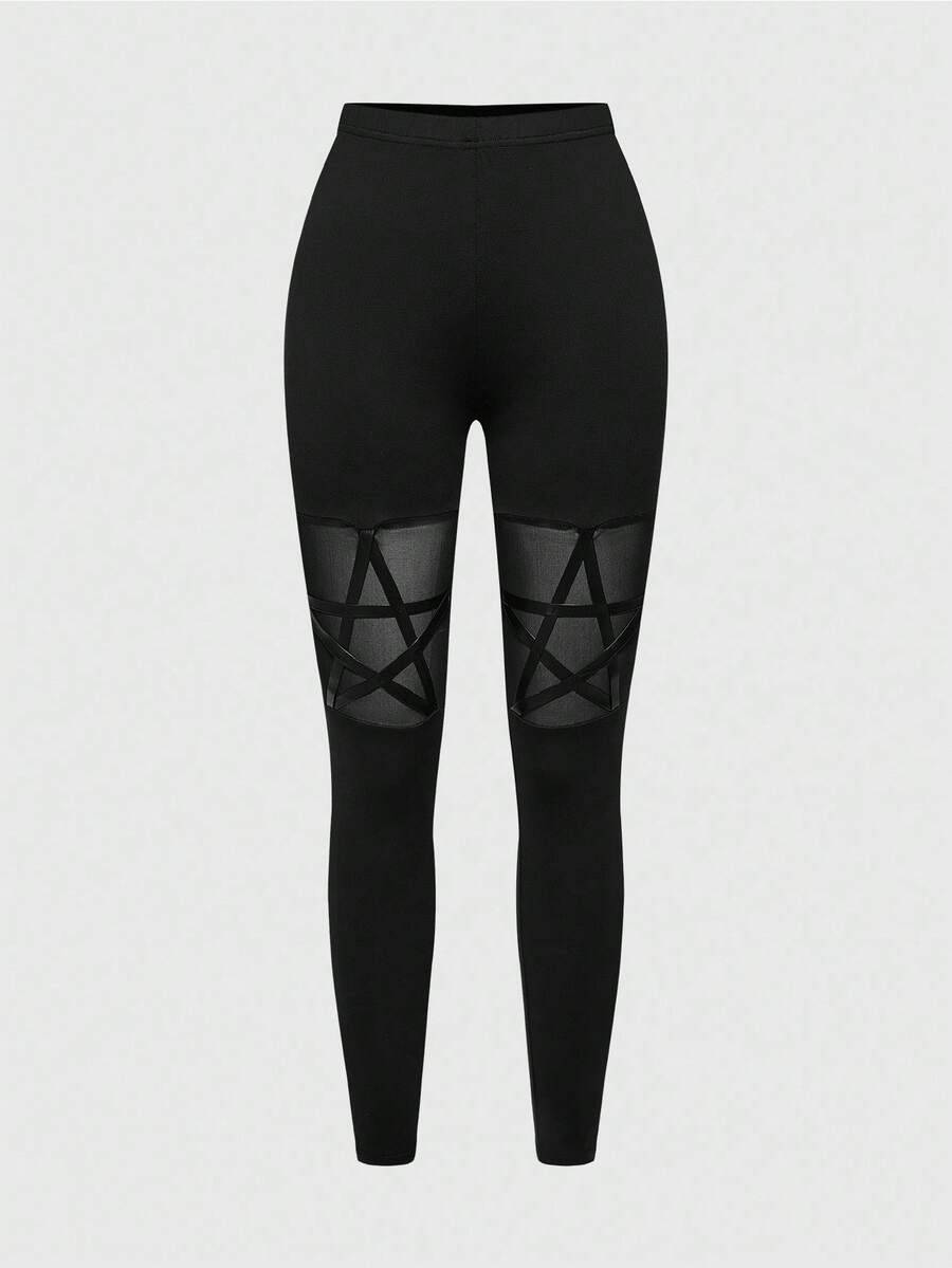 Goth سروال ضيق نسائي مزين بنجمة خماسية من الشبك الشفاف بطبعة بانك داكنة، مناسب لمناسبة هالوين