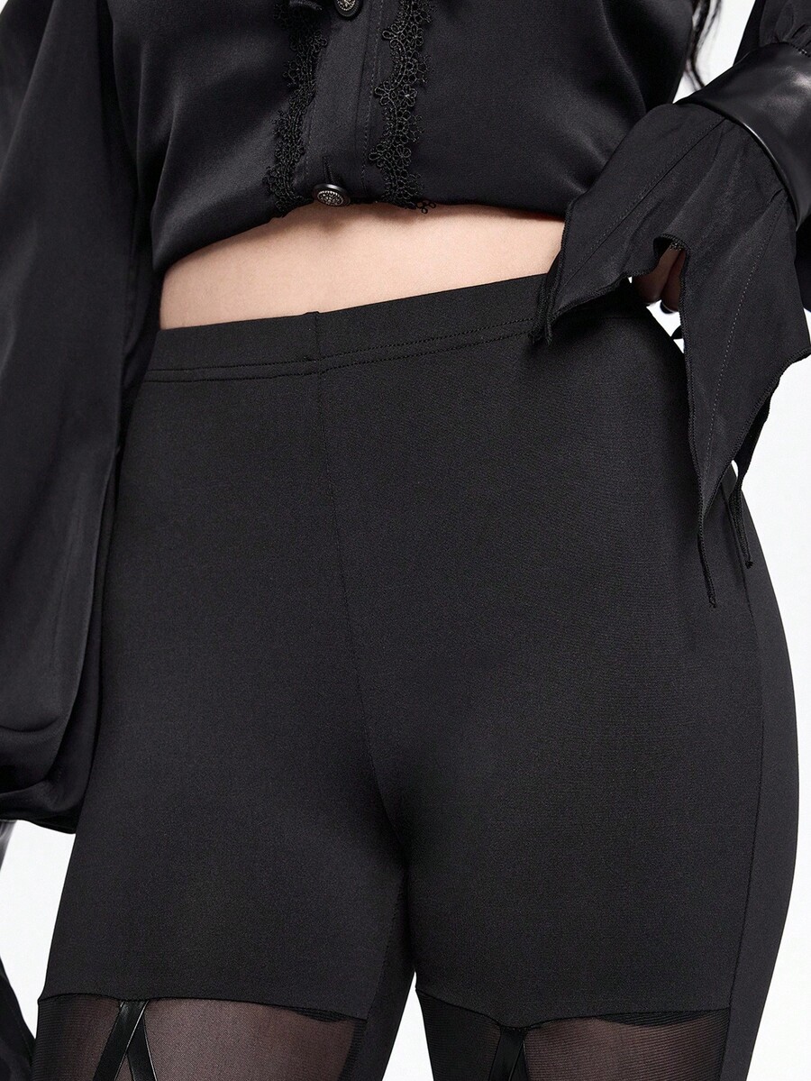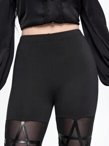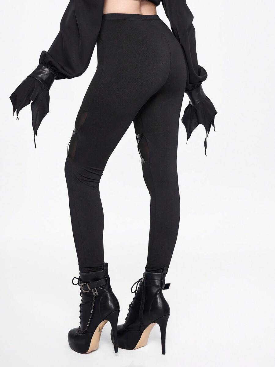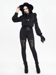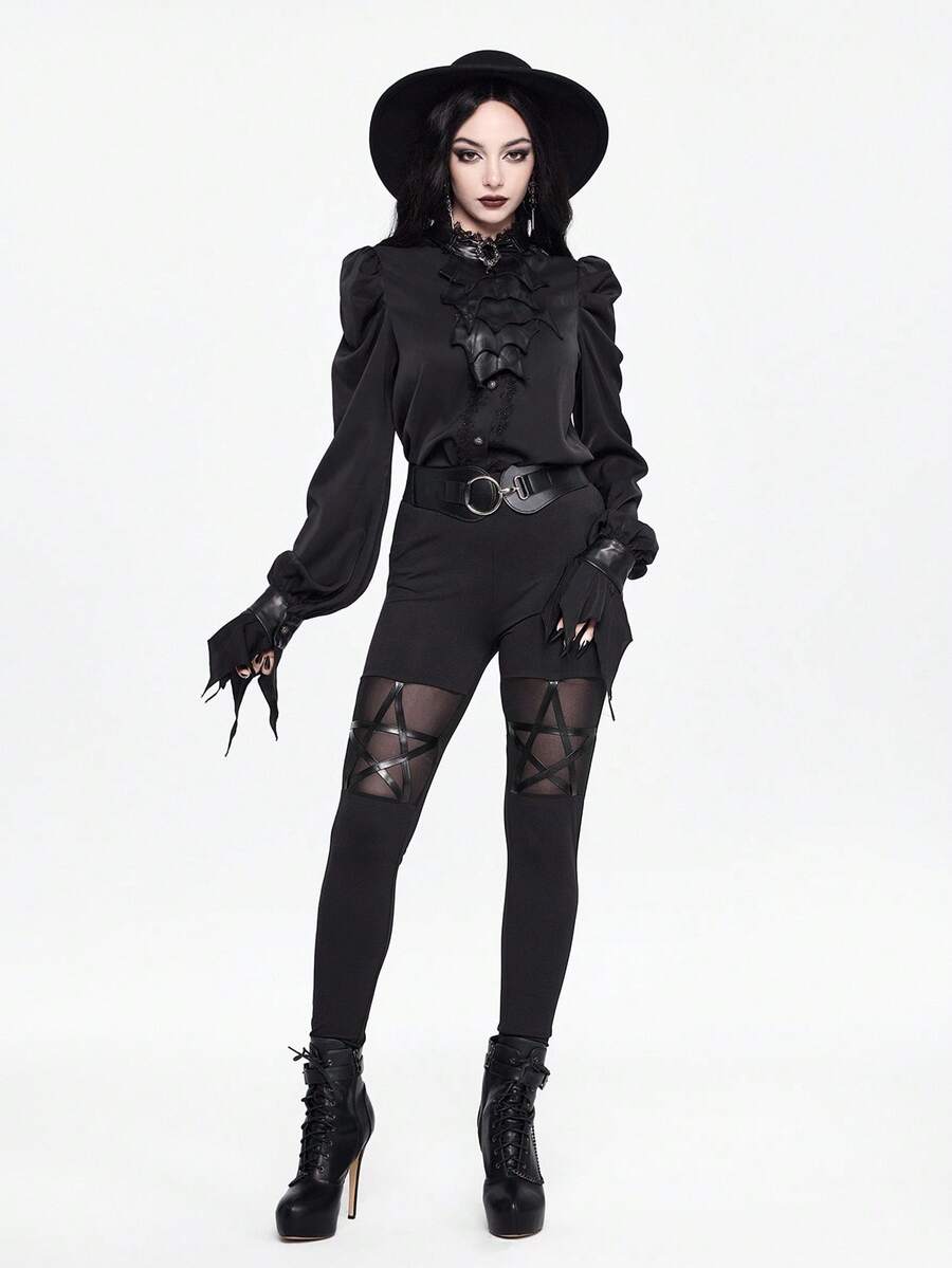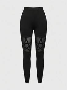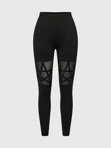 Goth سروال ضيق نسائي مزين بنجمة خماسية من الشبك الشفاف بطبعة بانك داكنة، مناسب لمناسبة هالوين