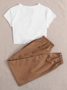 سروال رياضي بشريط عبارة مع تي شيرت بربطة امامية جرافيك عبارة