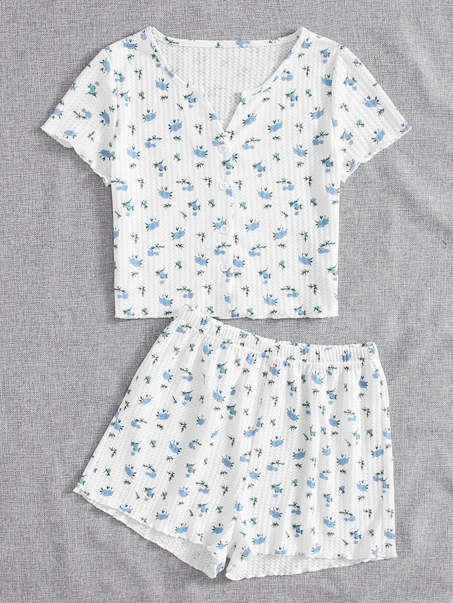 طقم بيجاما أمامي بأزرار برسمة زهور نثرية مجموعة بيضاء