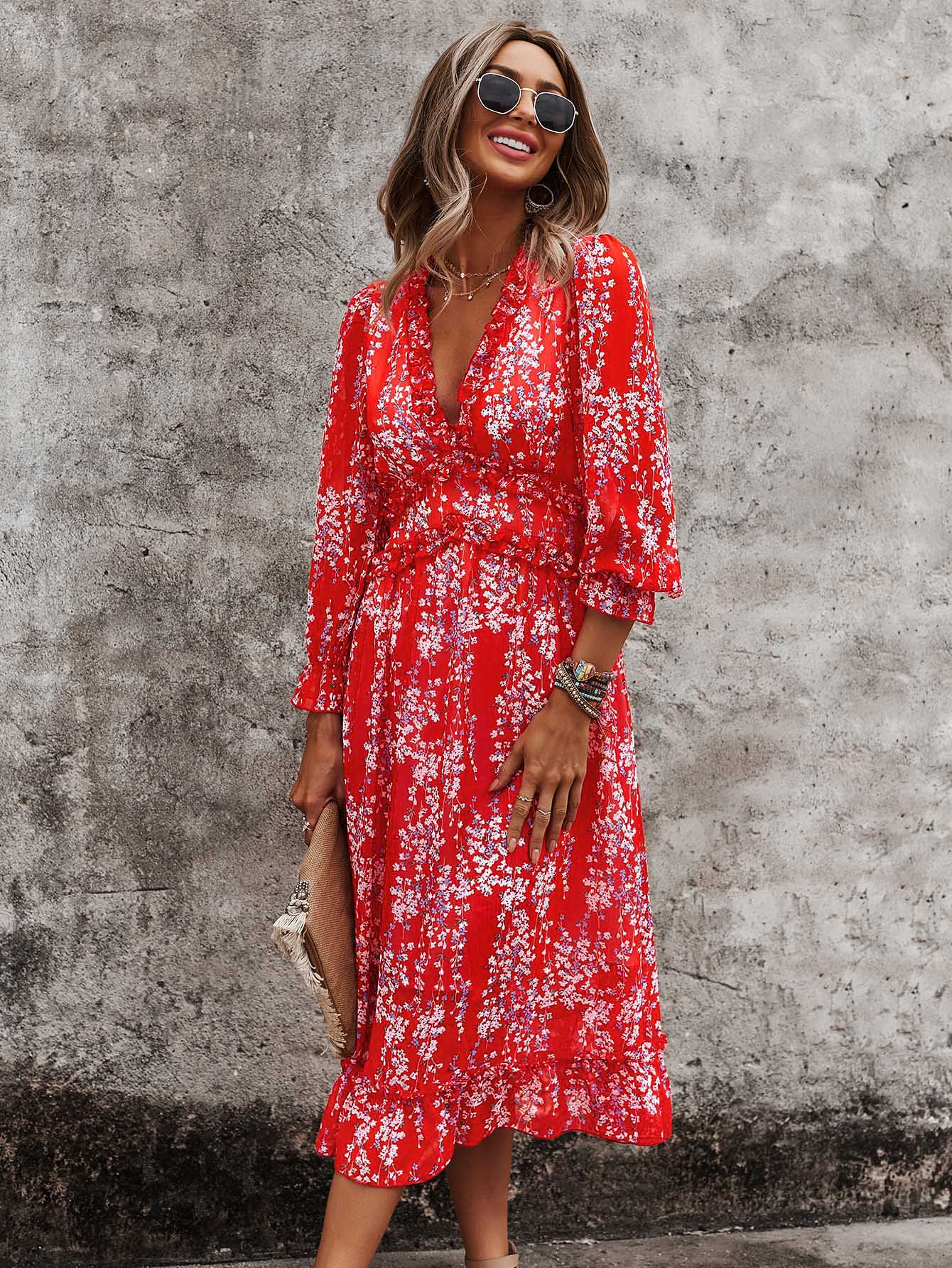 فستان ماكسي بياقة عميقة على شكل V وكشكشة في الذيل بطبعة زهور صغيرة، ملابس لرأس السنة الجديدة، ملابس للشاطئ والعطلات للنساء، ملابس خريفية للنساء