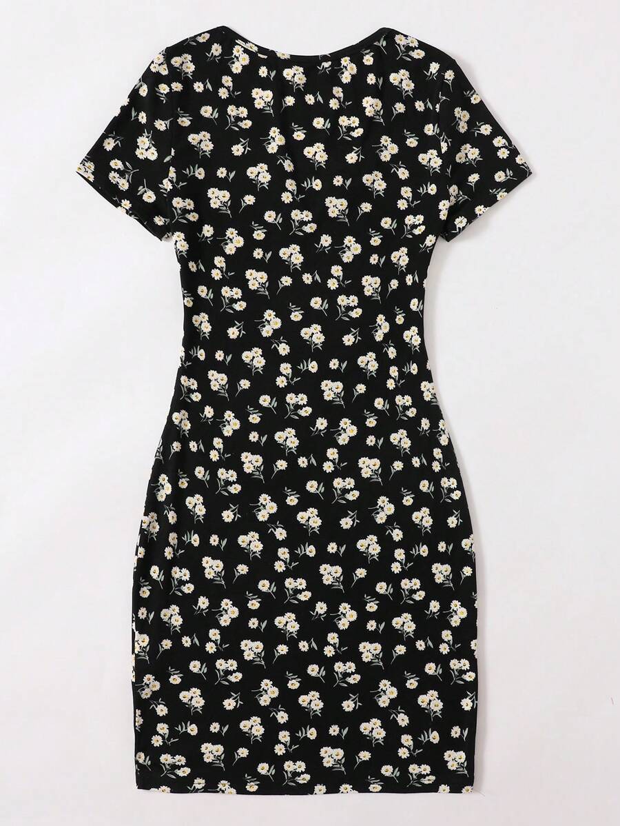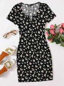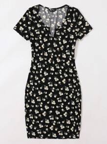 فستان ضيق بياقة مدببة مزخرف بنقوش زهور صغيرة