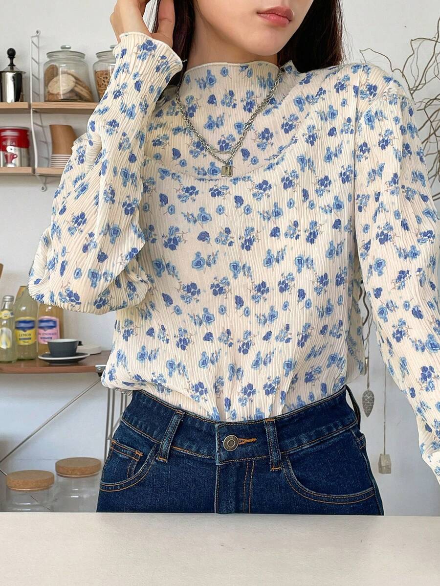 بلوزة بطبعة زهور صغيرة مع حافة من الخس، ملابس علوية بأكمام طويلة، ملابس خريفية مع طباعة جرافيك