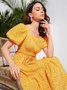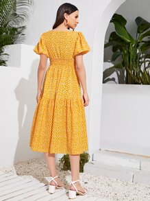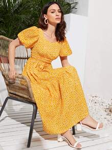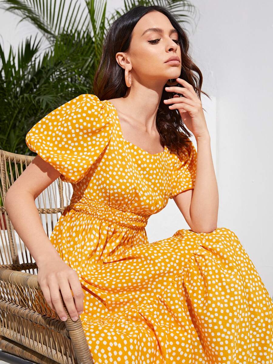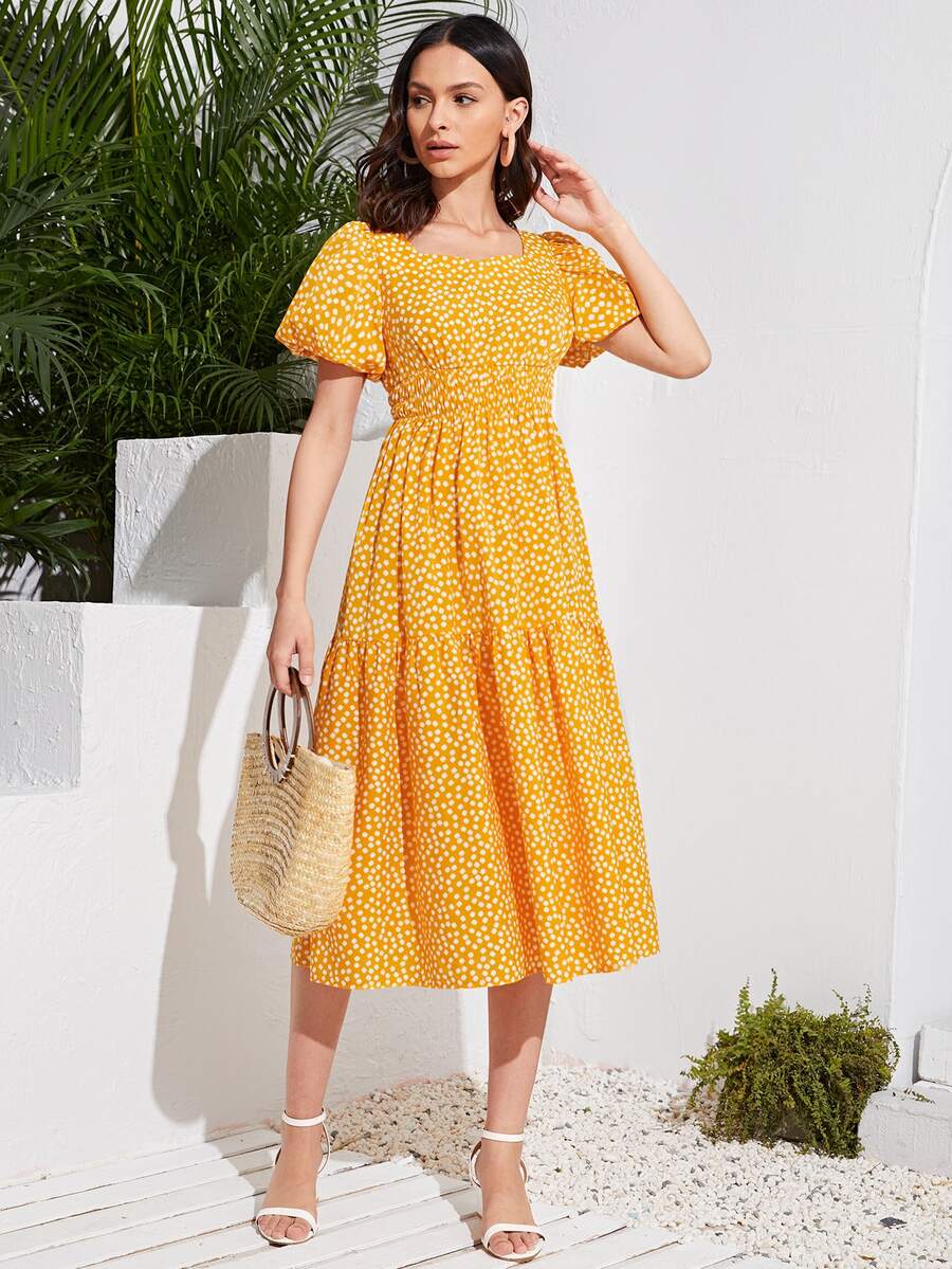 فستان بتفاصيل مدرز باكمام منفوخ مزهر