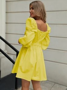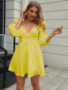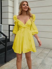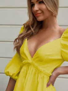 Double Crazy فستان قصير مقلم مكشكش بأكمام فانوس وبلون النيون ليموني