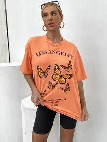 طقم شورت ركوب الدراجة مع تي شيرت بجرافيك عبارة وفراشة منخفض الكتف