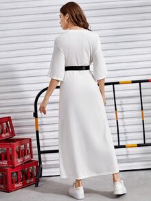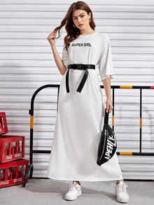 فستان بحزام مشبك وبجرافيك عبارة ومنخفض الاكتاف