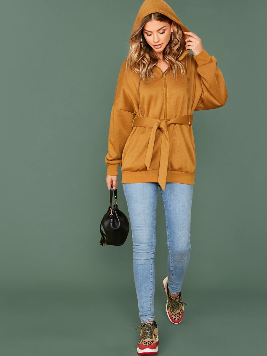 سويت شيرت مقنع برباط وبسستة مع أكتاف منخفضة مع حزام