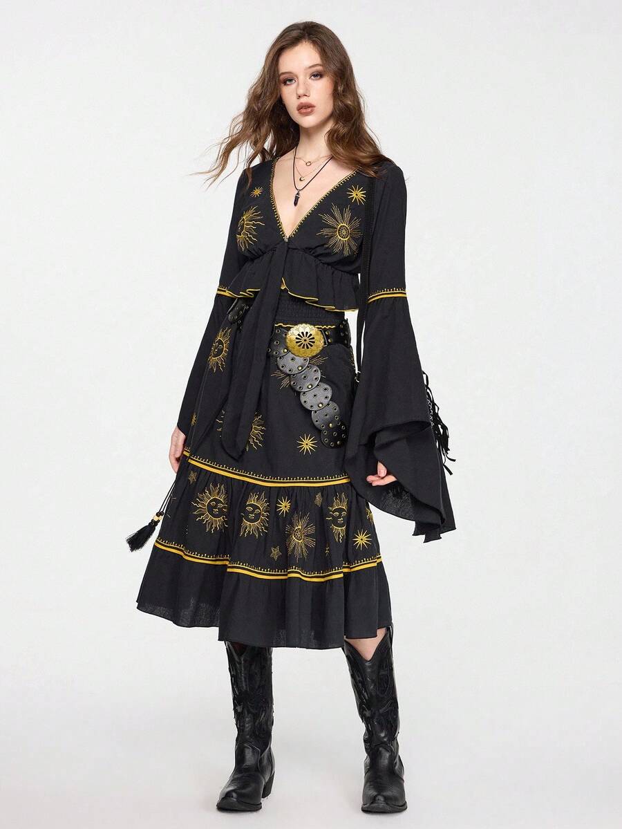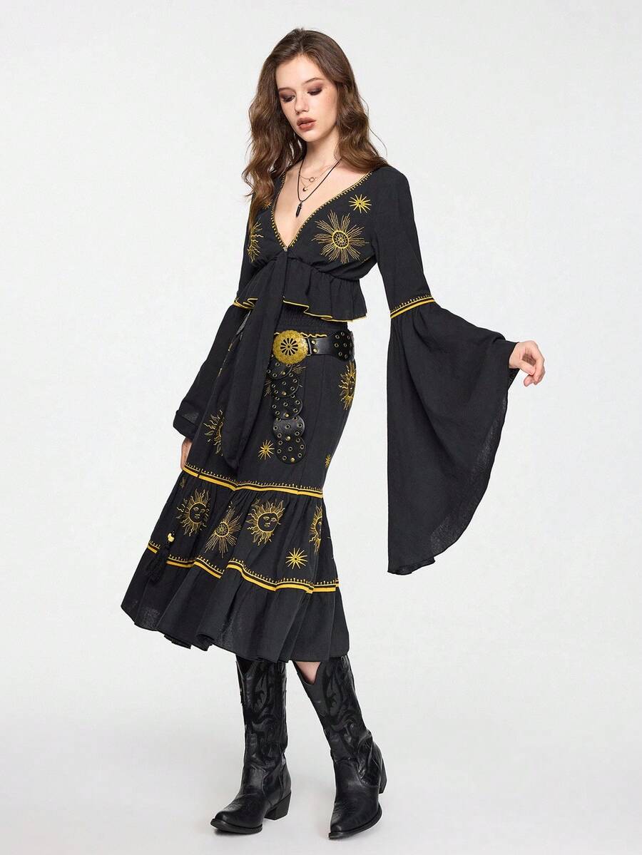 EDITION مجموعة تنورة وبلوزة مطرزة بنجوم وقمر للنساء للعطلات الرسمية، 2 قطعة/طقم
