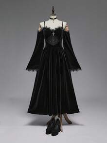 EDITION فستان ماكسي مخمل كبير الحجم بأكمام واسعة وفتحة عالية في الكتف، بطراز القصر المطرز، بطراز إسلامي داكن وأنيق مناسب لمناسبات الهالوين
