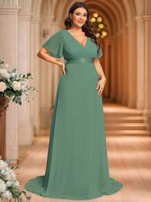 فستان وصيفة العروس أنيق بياقة على شكل حرف V مطوي عند الصدر باللون الأخضر، فساتين ضيوف الزفاف، فساتين رسمية للحفلات لمقاسات كبيرة في فصل الخريف والشتاء