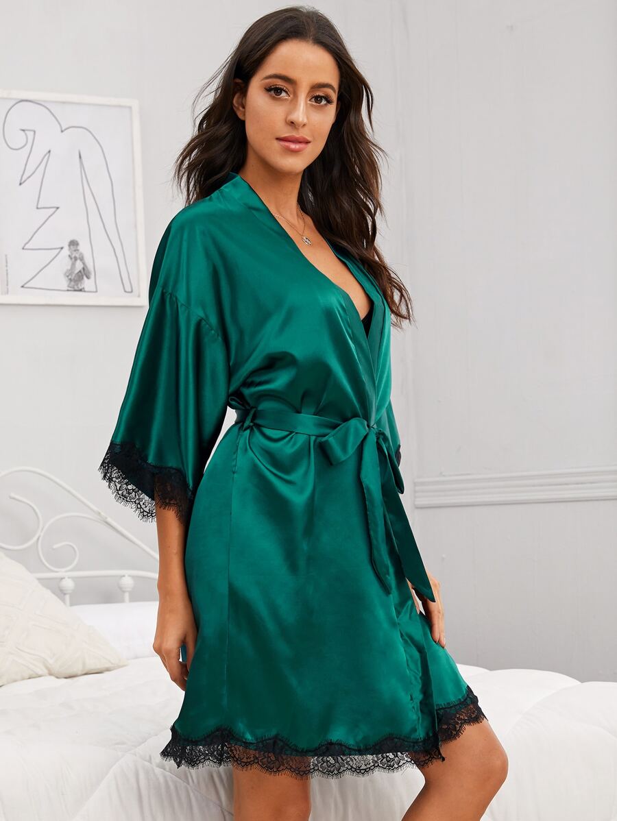 روب ليلي ساتان بحزام مقلم دانتيل مرمش