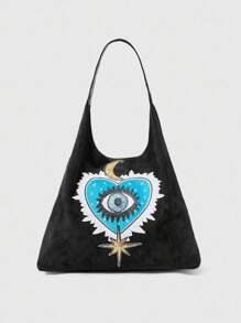 Fairycore حقيبة كتف جلدية مخملية بطبعة نجوم وقمر قديمة، حقيبة يد أنيقة نسائية