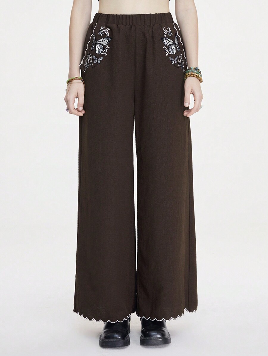 Fairycore بنطلون واسع الساق مستقيم التطريز بعنصر فراشة بوهيمي غوتي بجيوب وطرف موجي للنساء