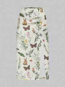 Fairycore تنورة نسائية ذات شق عالي مطبوعة بطبعات فطر وأرنب وورقة وزهرة مستوحاة من الطبيعة