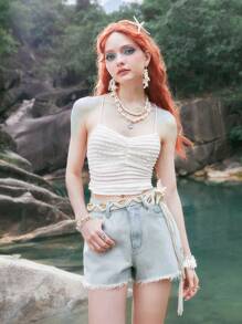 Fairycore شورت دنيم قشور السمك مطرز حافة خام