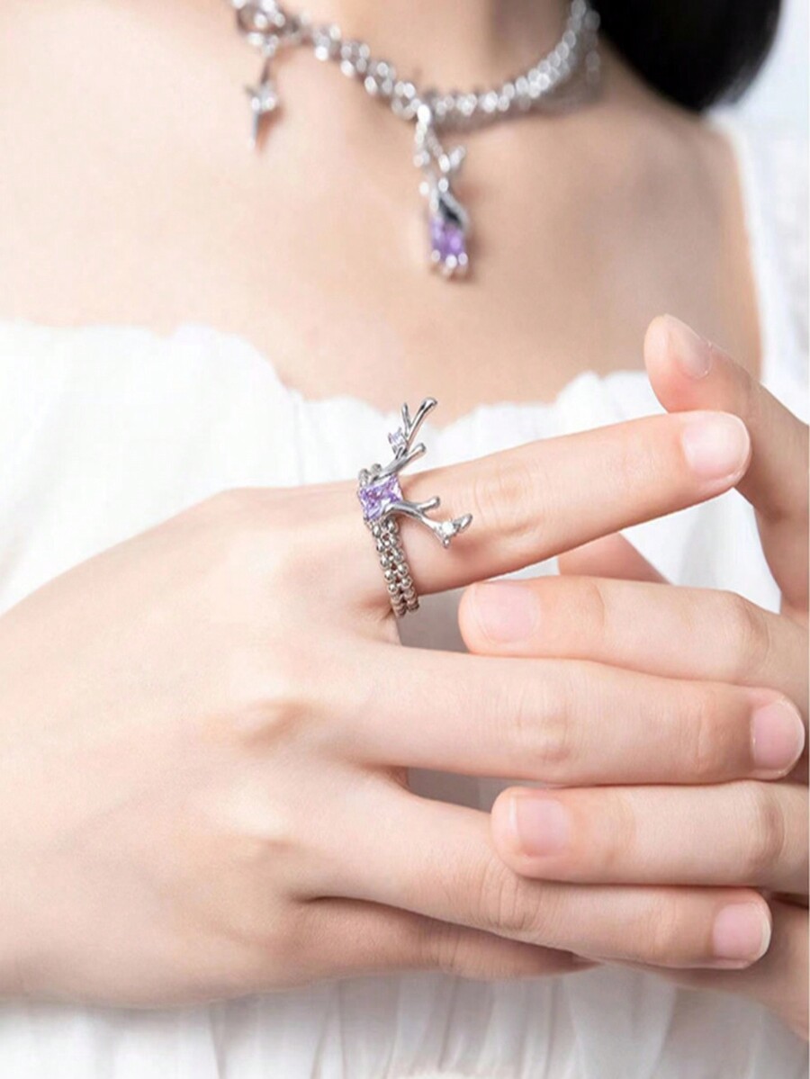 Fairycore خاتم على شكل قرن الوعل من الزركونيا المكعبة باللون الأرجواني للنساء، طراز Ins ذو لون رائع، زخرفة إصبع قابلة للتعديل