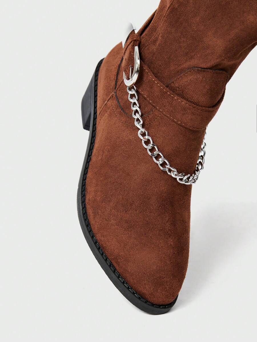 Fairycore إكسسوارات الأحذية الجلدية البنية متوسطة الطول مع سلاسل، إطلالة عصرية وصالحة للاستخدام اليومي بطراز أوروبي، من الجلد اللين، قمة مدببة، كعب عال 5 سم، مناسب لأجواء عيد الميلاد ورأس السنة الجديدة في فصلي الخريف والشتاء