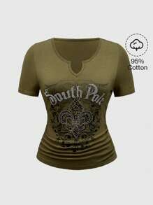 Fairycore تي شيرت قاعدي بطباعة رجعية أنيق للنساء في الصيف ، مدرسة