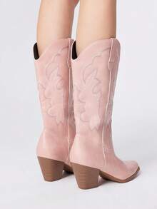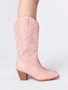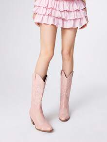 Fairycore بوت كاوبوي للنساء، بوت جلد مطرزة بارتفاع متوسط للساق، موضة خارجية كاجوال سهلة الارتداء والخلع، للربيع والخريف، بلون وردي