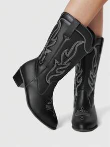 Fairycore بوت الكاوبوي النسائية ذات رؤوس مدببة وكعب سميك مطرزة بنقشات الفارس، بوت جلد عالية الكعب بتصميم على شكل V تصل إلى منتصف الساق، باللون الأسود الجريء