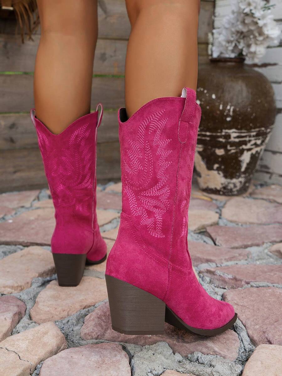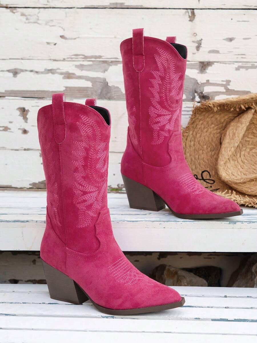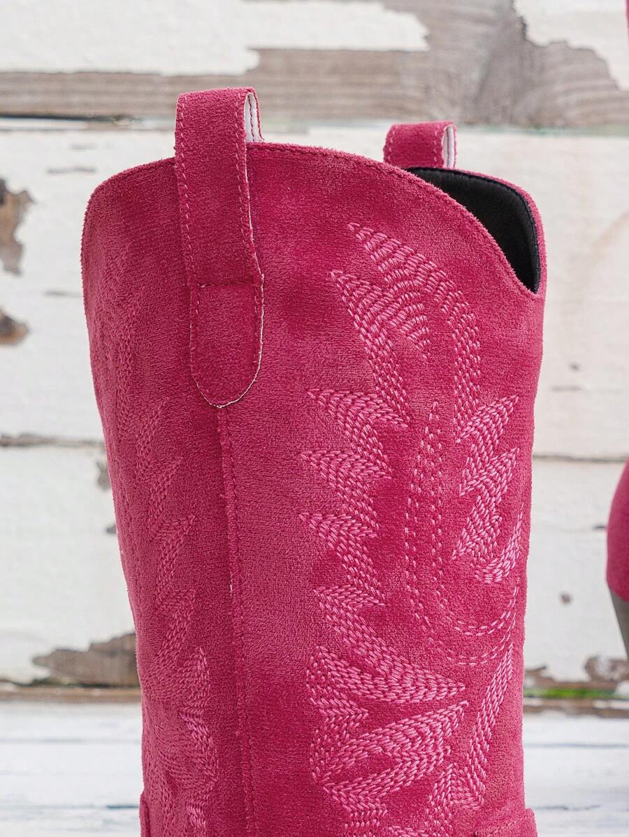 Fairycore بوت كاوبوي نسائية عالية الكعب بزخارف مطرزة ذات تصميم مدبب للقدم على شكل حرف V، لون وردي، بوت منتصف الساق للموضة والاستخدام الخارجي