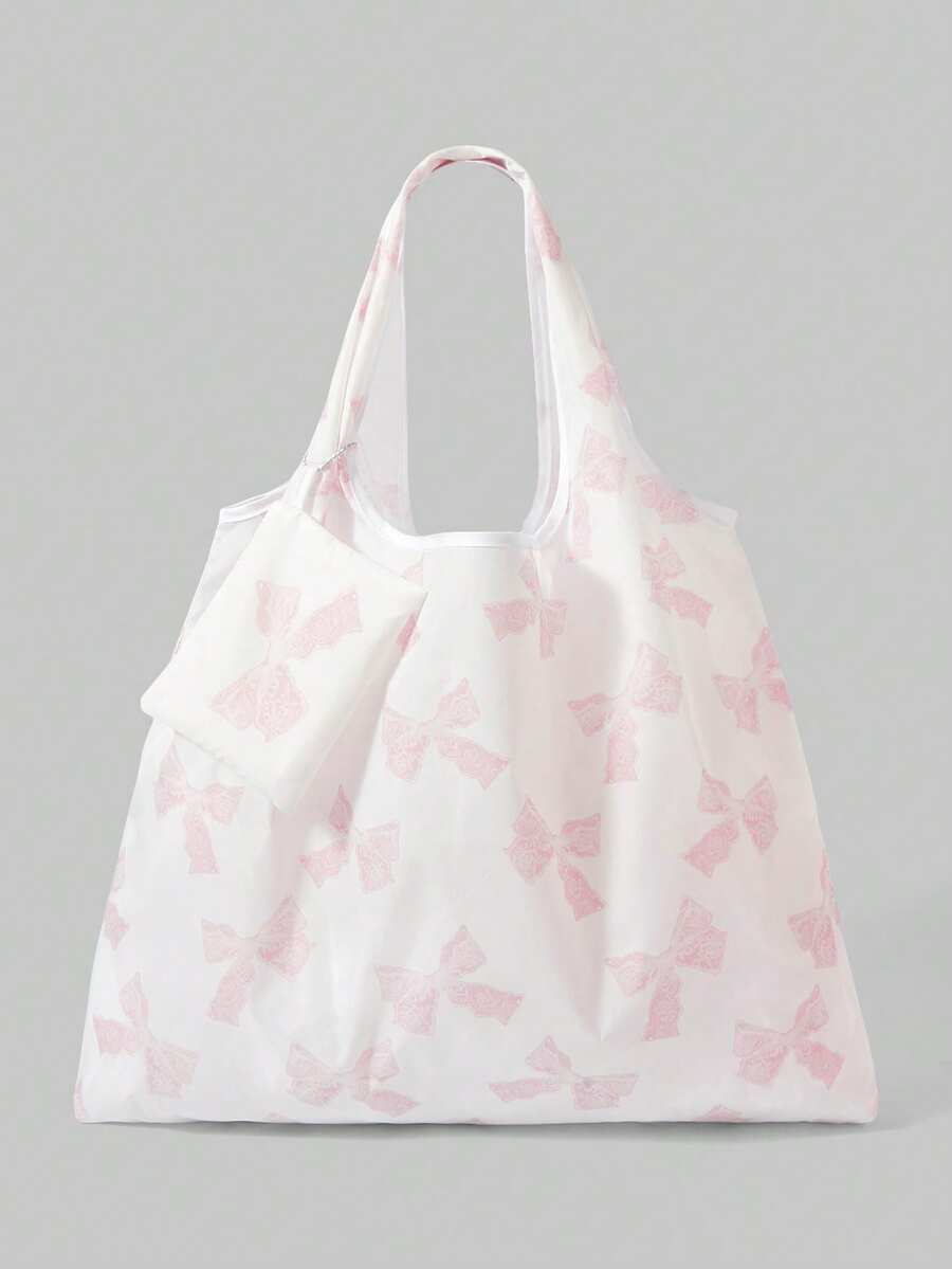 Kawaii حقيبة تخزين بنمط الفيونكة الأنيق، حقيبة تسوق قابلة للطي كبيرة السعة محمولة مع محفظة صغيرة