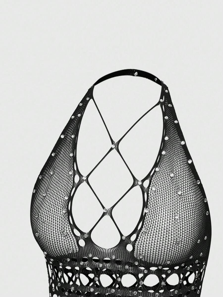 ROMWE Avant جمبسوت نسائية أنيقة وعصرية مزينة بالراين ستون ذات مرونة عالية وشبكة شفافة