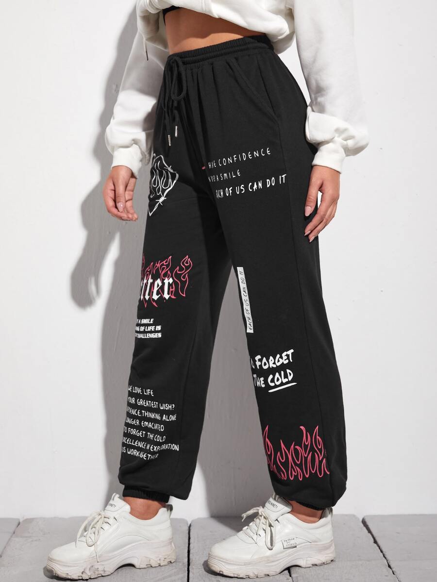 بنطلون رياضي برباط خصر بجيب مائل وبجرافيك شعار ونار