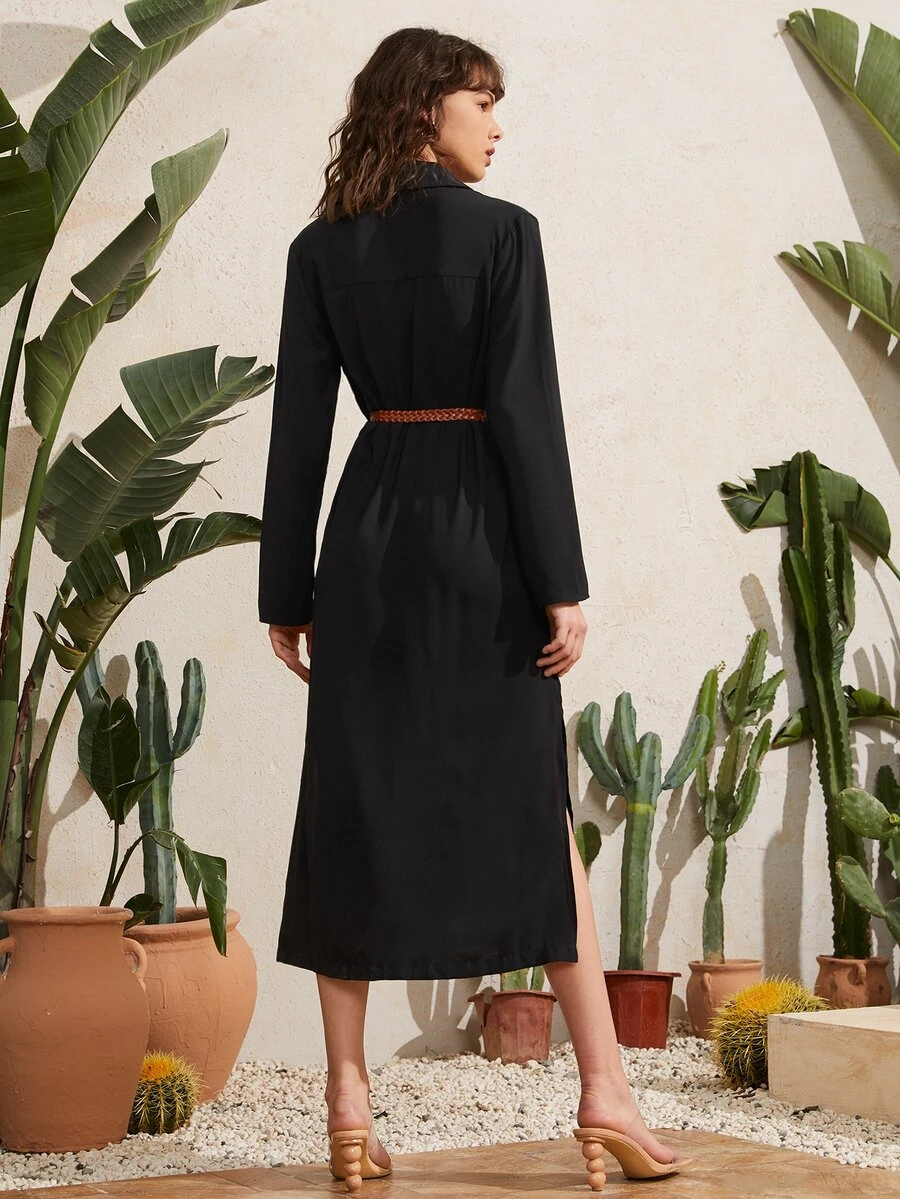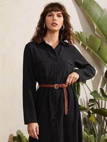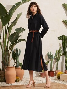 فستان قميص نحيل بفتحة بتفاصيل رفرف بدون حزام