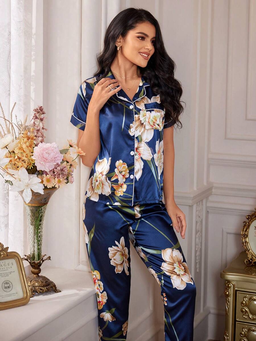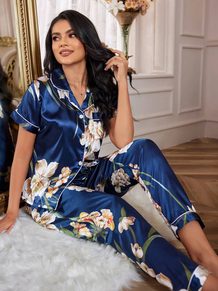 طقم بيجامة ساتان مع تفاصيل زهرية