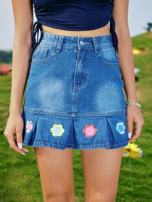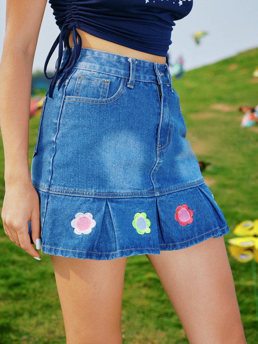 تنورة دنيم مطرز بأزهار حافة مكشكشة