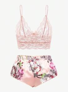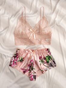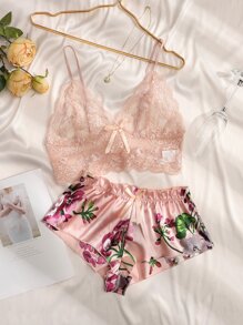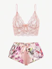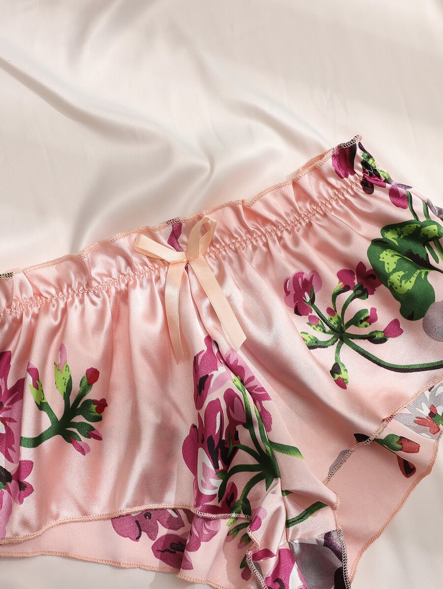 حمالة صدر بتفاصيل زهرية مع سراويل قصيرة زهرية، ملابس داخلية