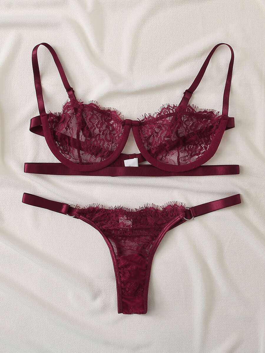 مجموعة ملابس داخلية جذابة ذات وسادة سلكية وسروال مع تفاصيل زهرية من الدانتيل