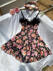 فستان ليلي كامي طباعة الأزهار مزين شبكة