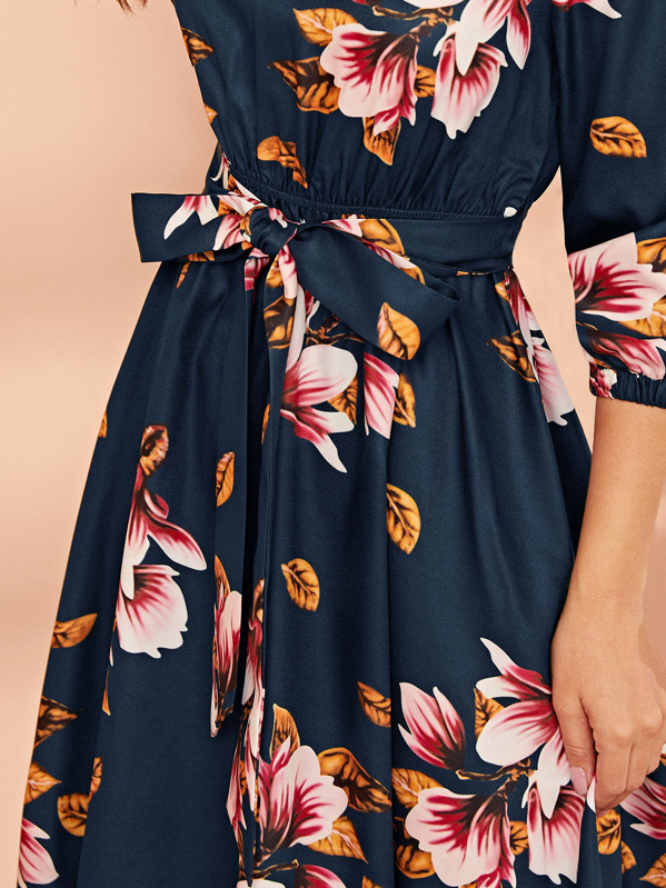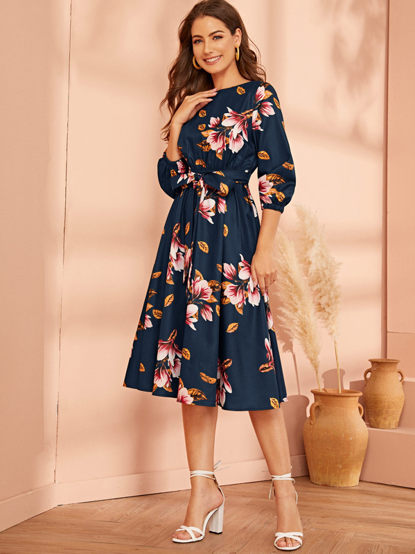 فستان بحزام وبطباعة زهر