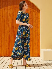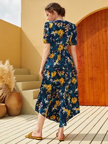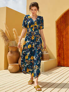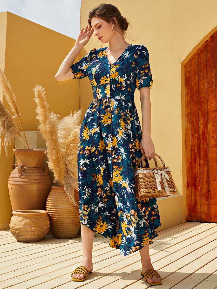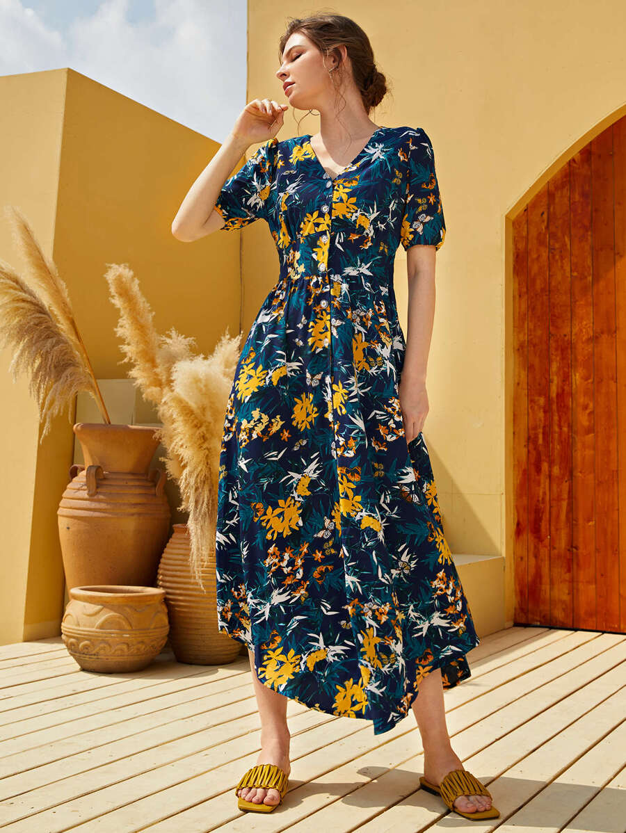 فستان بخط A بأزرار امامي وبطباعة زهر