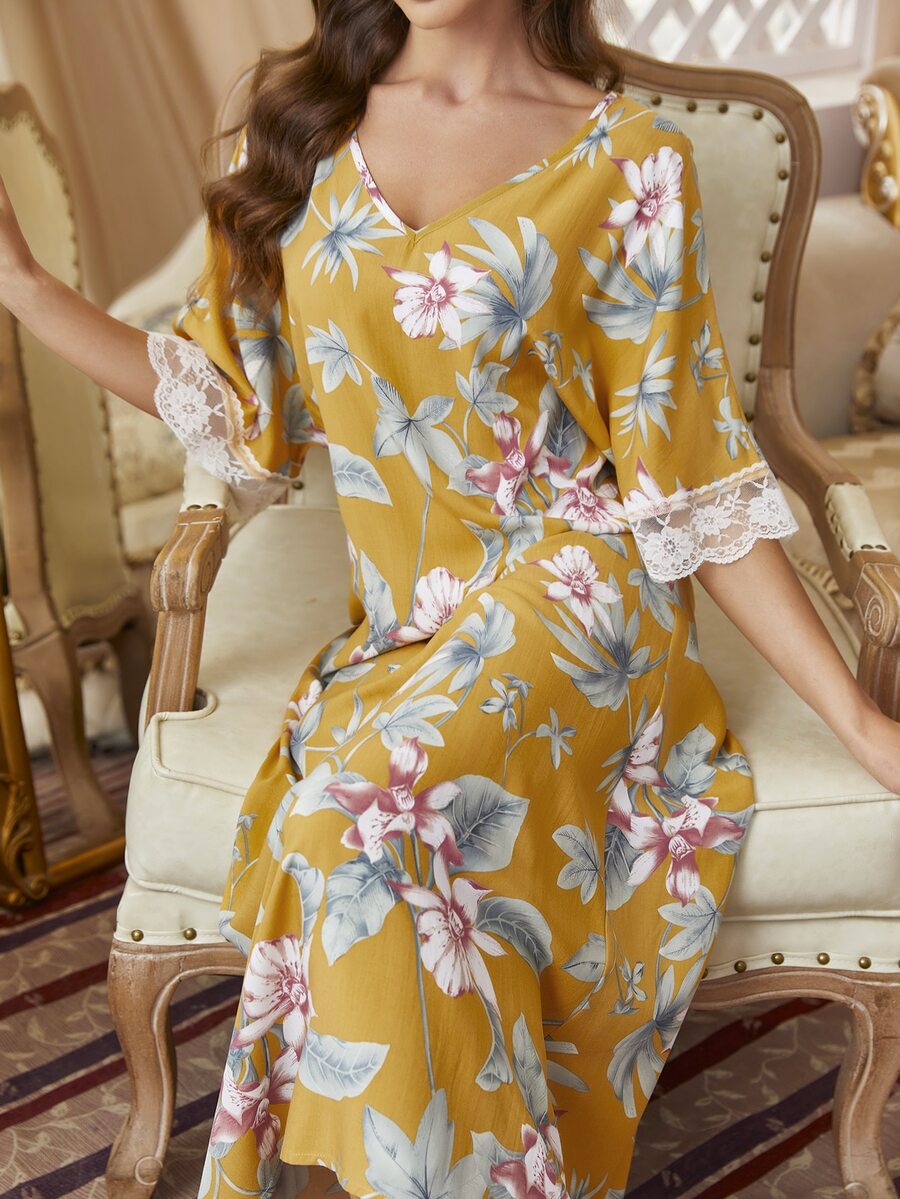 فستان نوم طباعة الأزهار دانتيل متباين اللون اكمام جناح خفاش