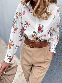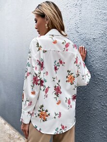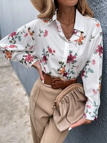 قميص طباعة الأزهار منخفض الاكتاف أزرار أمامية