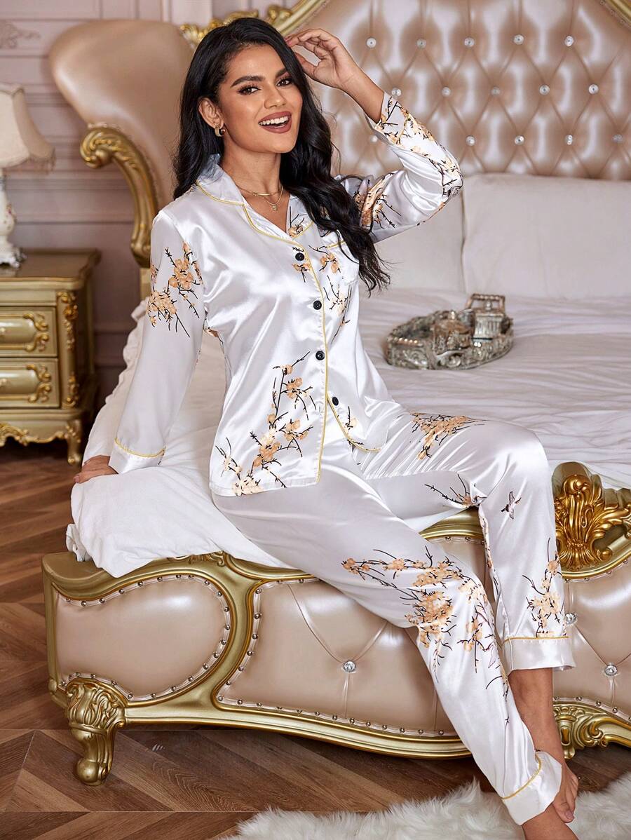 طقم بيجامة ساتان مطبوع بنقشة زهرية مع جيب ولحمات تباين، طقم أبيض ملابس داخلية عروس، تفاصيل دافئة وأنيقة للخريف والشتاء
