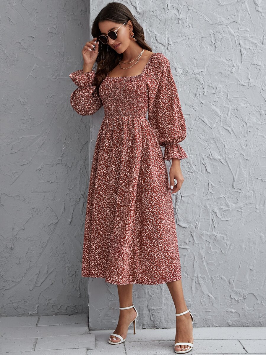 فستان بطباعة نبات ومدرز باكمام منتفضة
