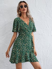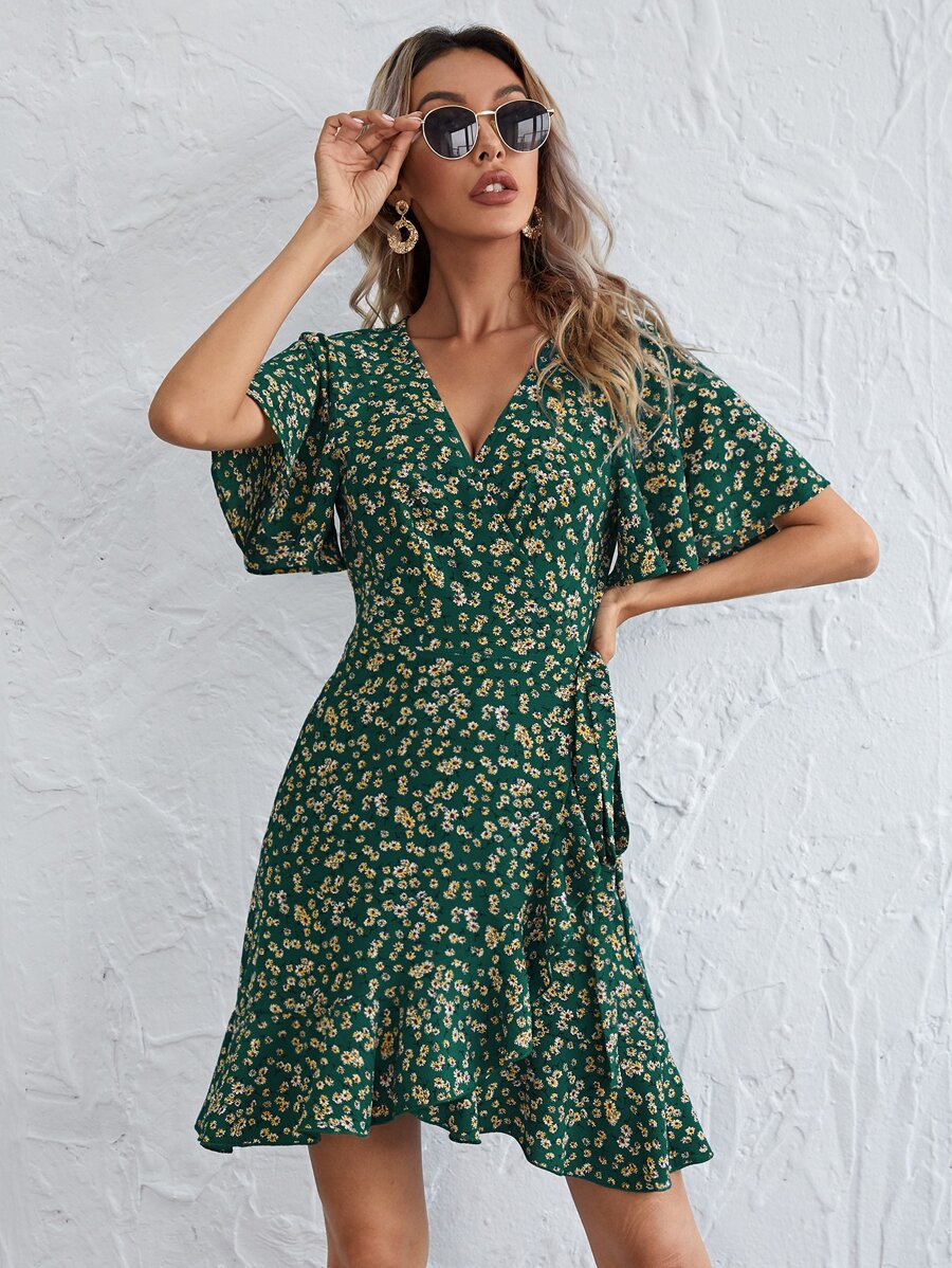 فستان بزهر اقحوان وبربطة امامية مطوي باكمام رفرف