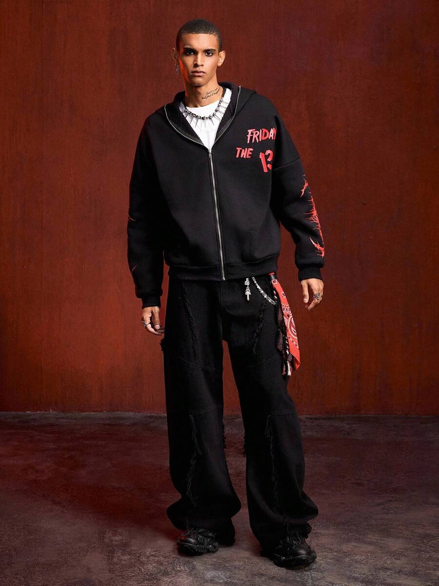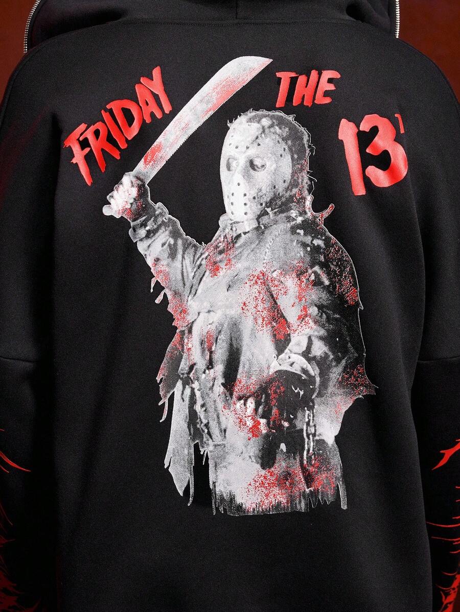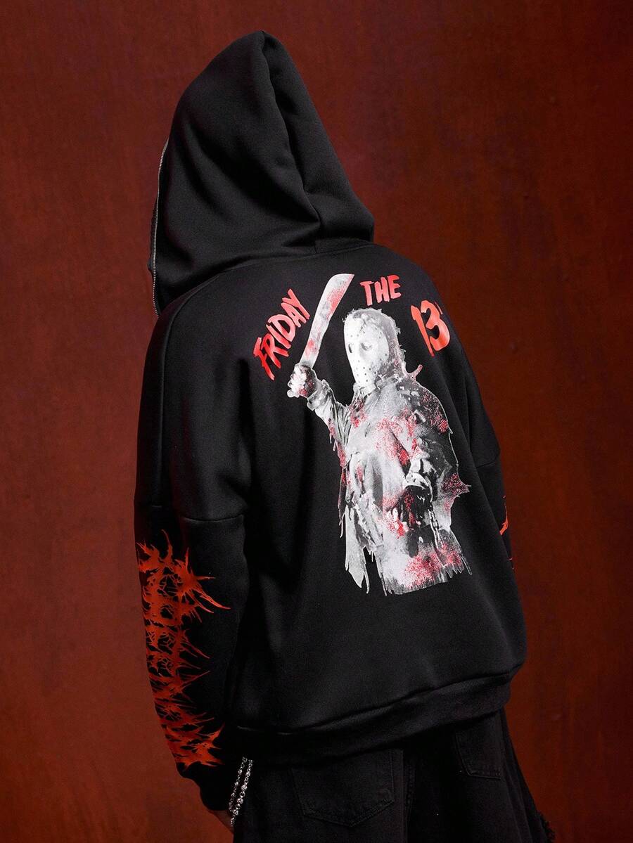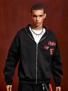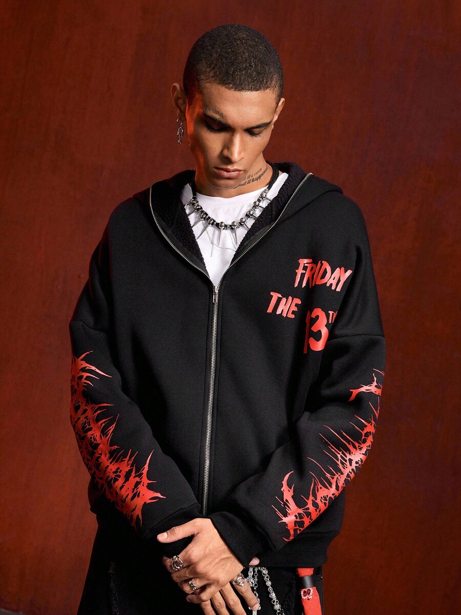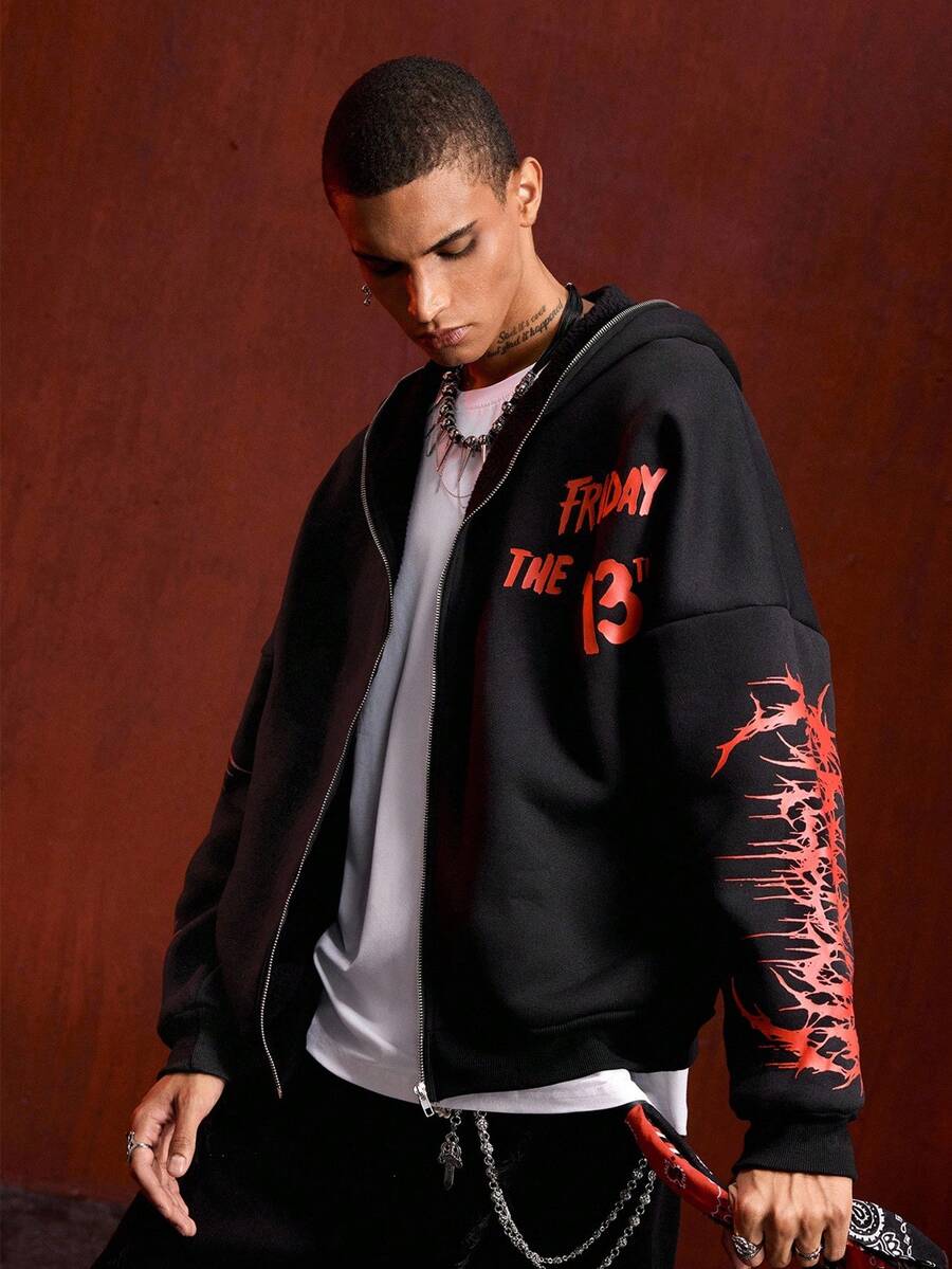 Friday the 13th X ROMWE Street Life بلوزة رياضية مزودة بسحاب للرجال، بطبعات شعارات وأشكال جرافيكية عصرية، مناسبة للشارع والموضة الكاجوال، للخريف والشتاء