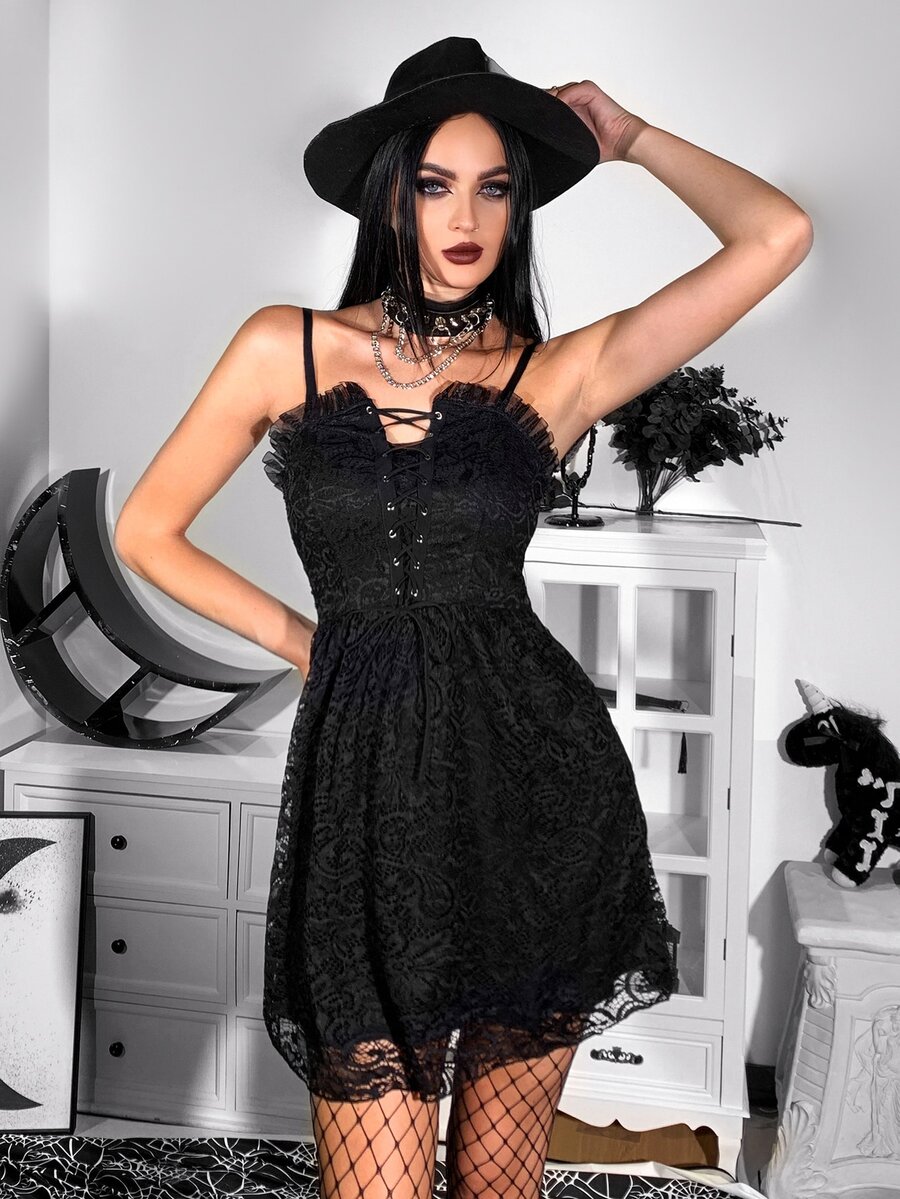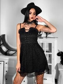 فستان كامي بدانتيل وبرباط امامي مقلم بهدب