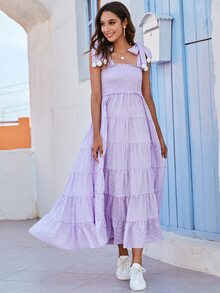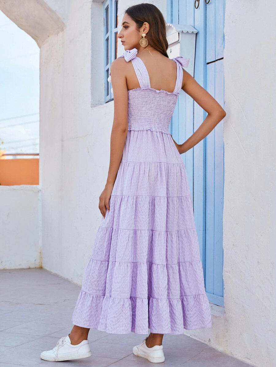 فستان بحمالات وبتفاصيل كرات مخملية مدرز ومخطط مربعات