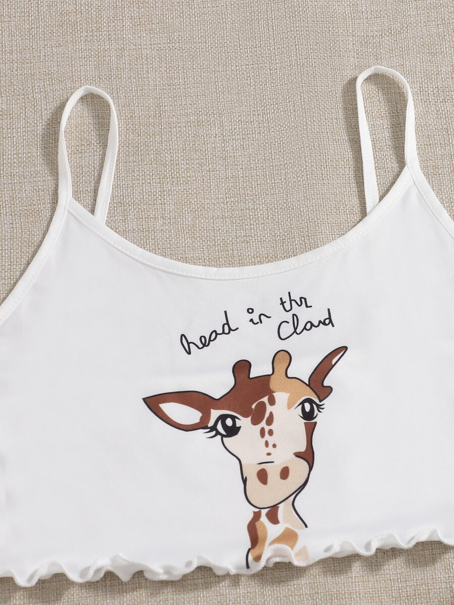 طقم بيجامة توب كامي أبيض بطباعة زرافة وشعار وشورت